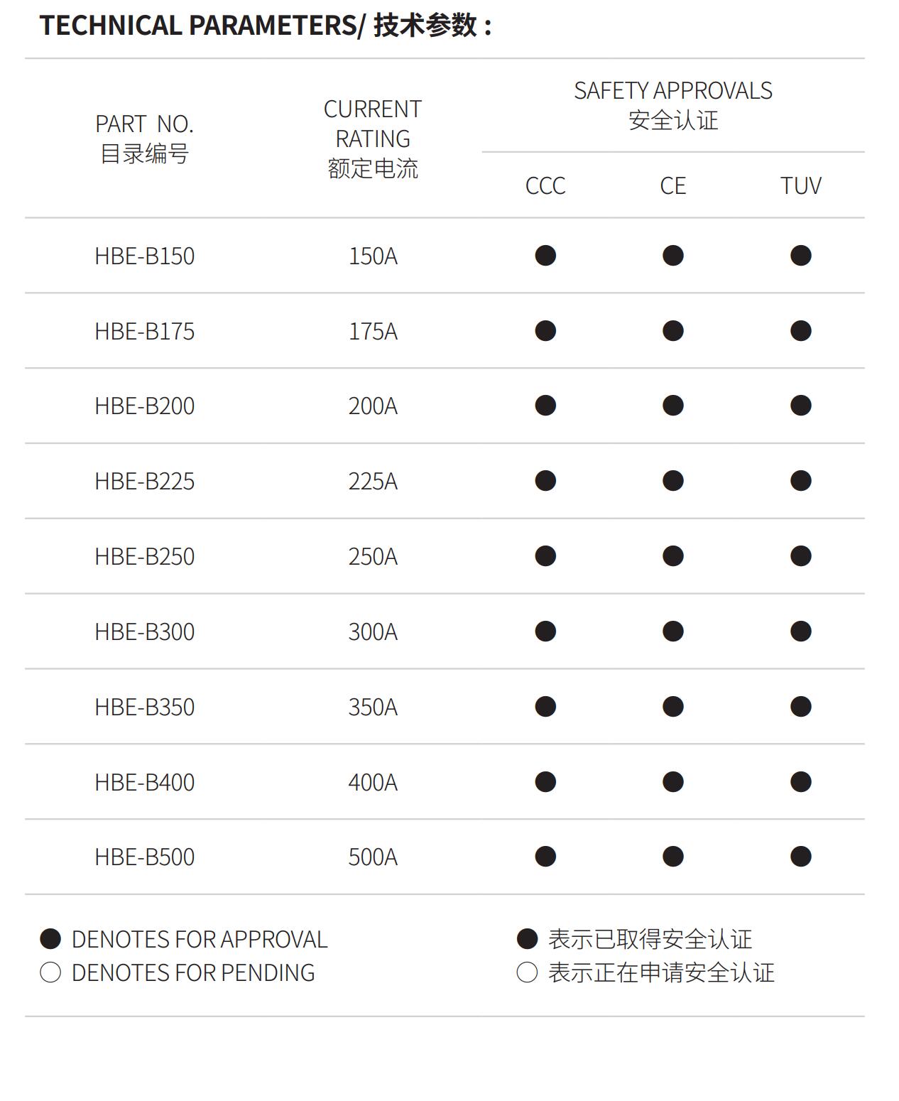 额定电流:150A-500A 额定电压:1000V DC 参考标准:IEC 60269-4, GB/T 13539.4, UL 248-13 安全认证:CCC,TUV,CE
